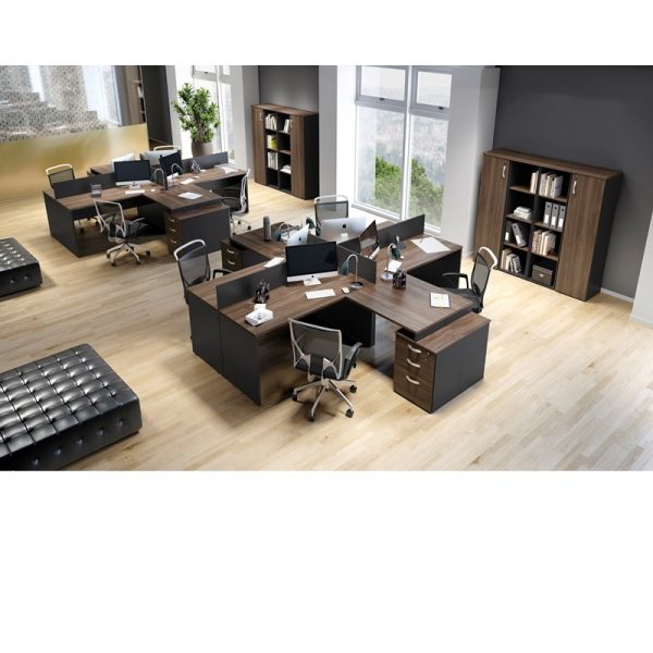 MESAS: Tampos em MDP 25mm, Painel Frontal em MDP 15mm, Pé Painel em MDP 25mm com Sapata Niveladoras, Perfis em Fita de Borda ABS 1mm. Fixação c/ Minifix.