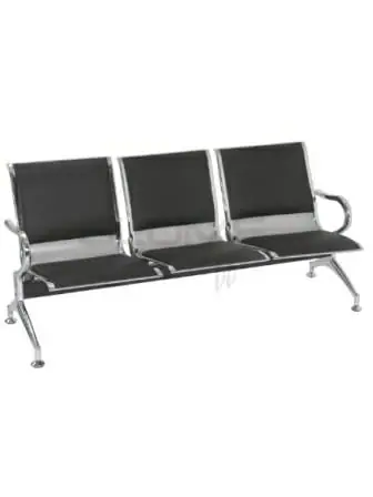 Longarina com braços e pés cromados, acabamentos laterais do assento e do encosto cromados, pintura do assento e encosto em epóxi na cor cinza, sapatas reguláveis e estofamento em couríssimo na cor preta. Disponivel com 02 e 03 lugares..